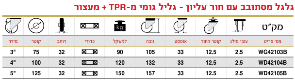 גלגל "3 חור עליון גליל TPR מיסב אטום למשקל 100 ק"ג + מעצור
